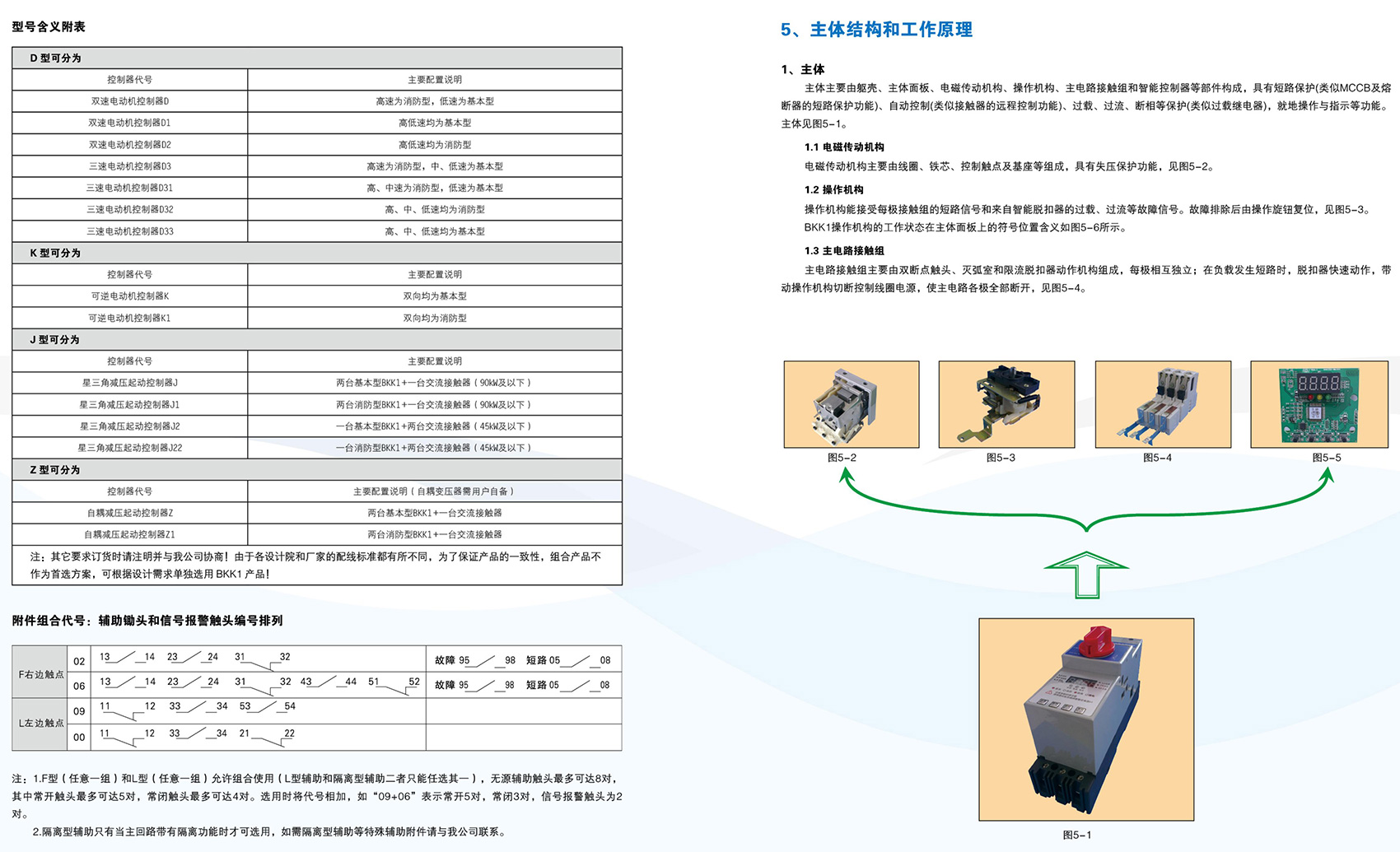 BKK1系列控制与保护开关电器主要用于交流50Hz(60Hz)、额定电压至690V、额定工作电流自0.4A至125A的电力系统中接通、承载和分断正常条件(包括规定的过载条件)下的电流,且能够接通、承载并分断规定的非正常条件(如短路)下的电流。BKK1系列采用模块化的单一产品结构形式,集成了传统的断路器(熔断器)、接触器、过载(或过流、断相)保护继电器、起动器、隔离器、电机综合保护器等多种传统的分离元器件。产品具有远距离自动控制与就地人力控制兼有的方式进行控制操作的功能,具有协调配合的时间-电流保护特性,具有控制与保护自配合、短路后连续运行,具有分断能力高,飞弧距离小、寿命长,具有保护整定电流均可调的特性,操作方便、配套模块多样齐全等优点,可以实现对电动机负载、配电负载的控制和保护。产品符合GB/T 14048.9《控制与保护开关电器》标准。